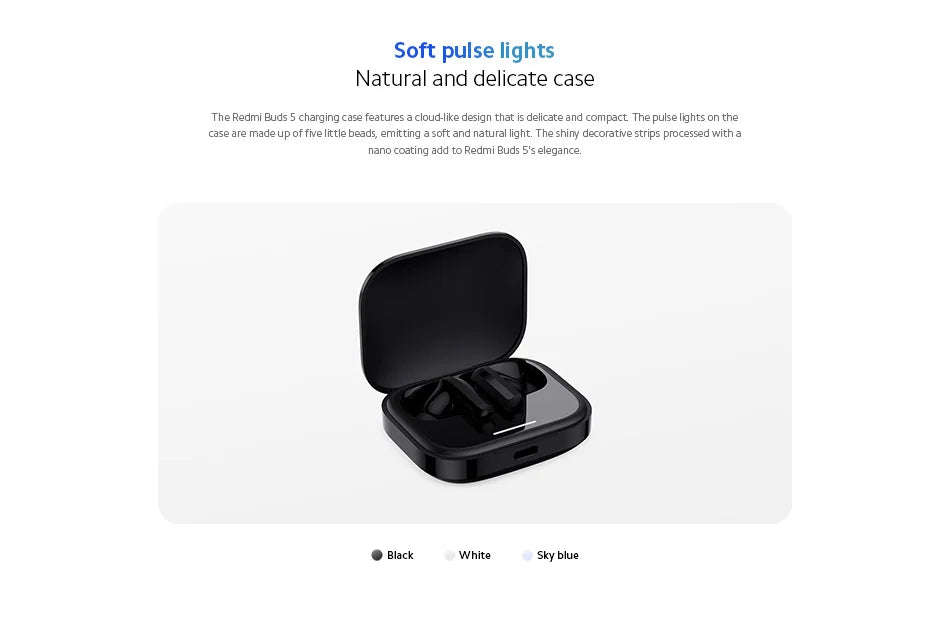 The Redmi Buds 5 charging case features a cloud-like design that is delicate and compact. The pulse lights on the